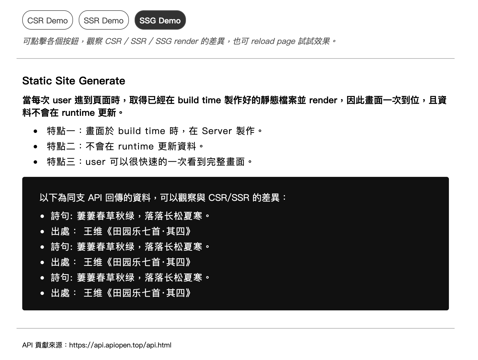 p.s. 如果採用 npm run dev 是無法觀察出 SSR / SSG 的差異,需要使用 npm run start 才能觀察出差異。npm run start 前,記得要先 npm run build。
