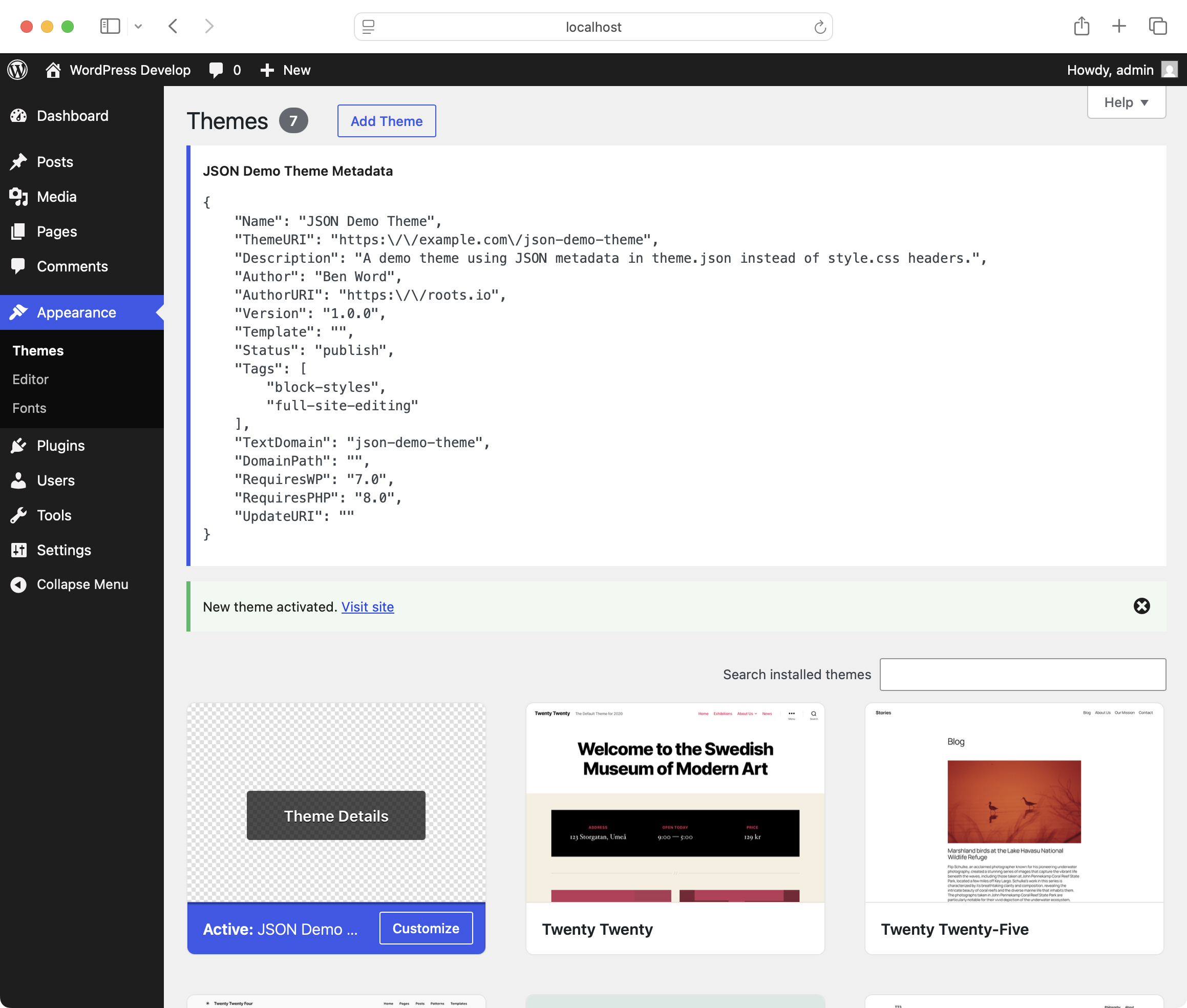theme.json→metadata)read_json_metadata()private method onWP_Themereadsmetadatafromtheme.jsonstyle.cssheaderstheme.jsonmetadata can now work without astyle.cssfilevalidate_current_theme()to allow active themes (including child themes) withoutstyle.csswhentheme.jsoncontains validmetadata.nametheme.jsonextra_theme_headersfilterSchema notes