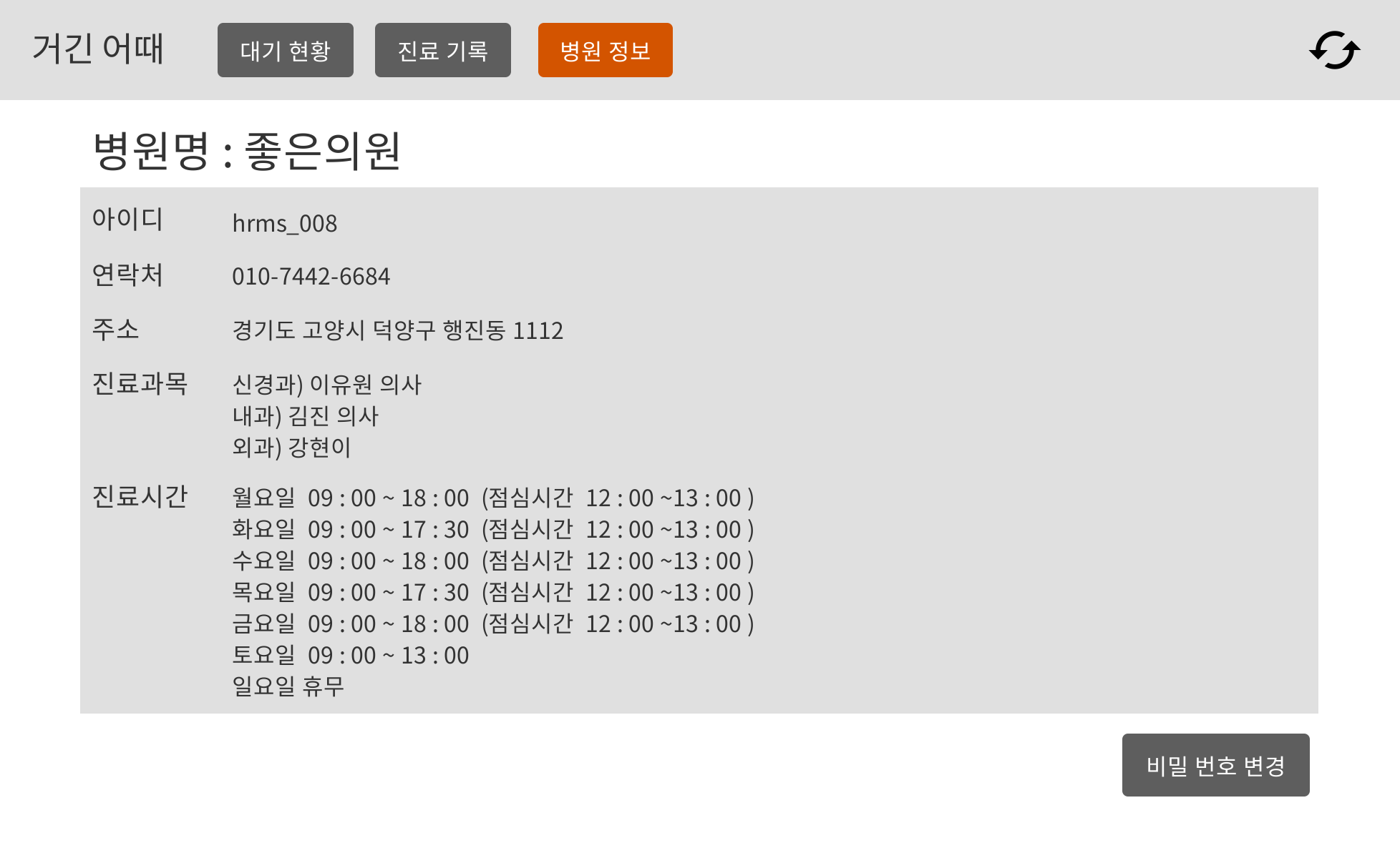 - 병원 정보를 확인할 수 있다. (병원명, 아이디, 연락처, 주소, 진료과목-진료의, 진료시간)