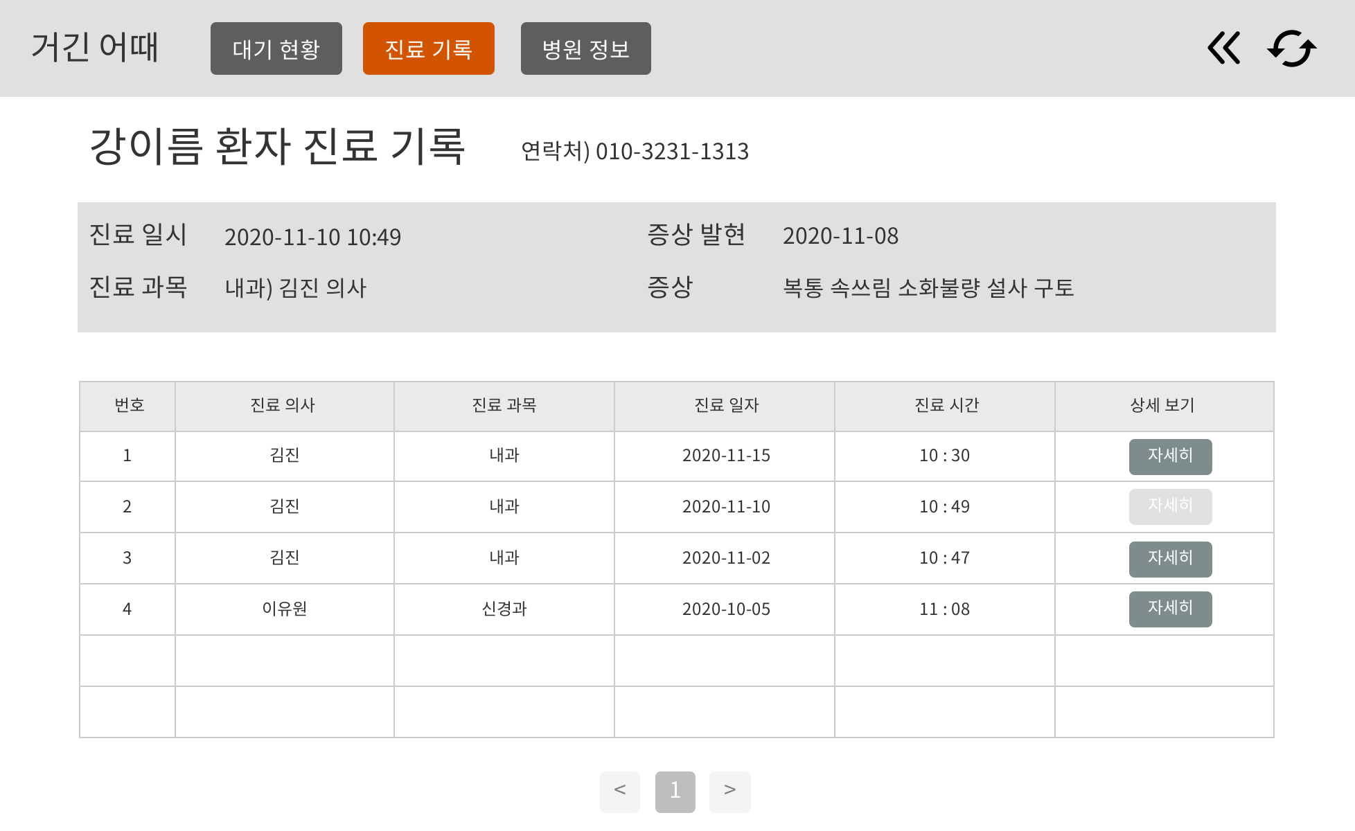 - 선택한 진료 기록에 대하여 다음 정보를 확인할 수 있다. (진료 일시, 진료 과목, 진료의, 증상)