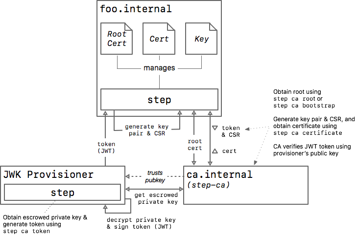 To create a JWK provisioner you generate a key pair, represented as a JSON Web Key (JWK), and register the public key with the CA. Optionally, the CA can escrow the corresponding private key (symmetrically encrypted with a password).